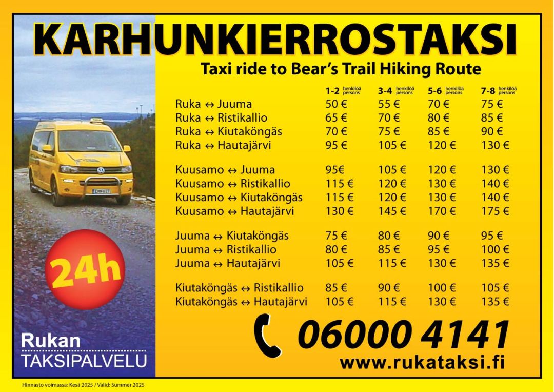 Rukan Taksi ja Huoltopalvelu Oy is a family company founded in 1993. Our company operates at the Ruka-Kuusamo area offering taxi and minibus transport. For larger groups, we have a coach that seats 50 people.